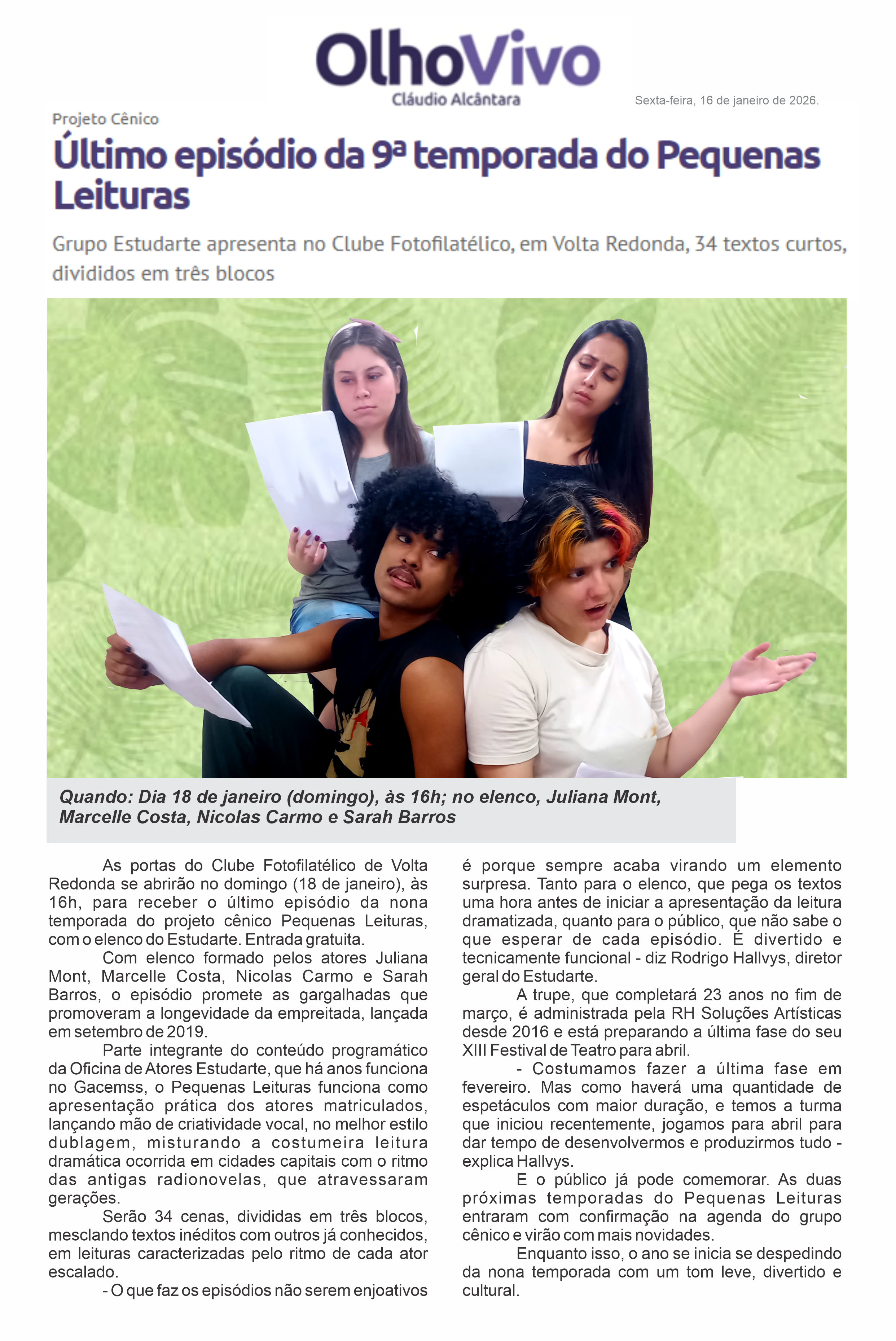Último episódio da 9ª temporada do Pequenas Leituras Grupo Estudarte apresenta no Clube Fotofilatélico, em Volta Redonda, 34 textos curtos, divididos em três blocos |