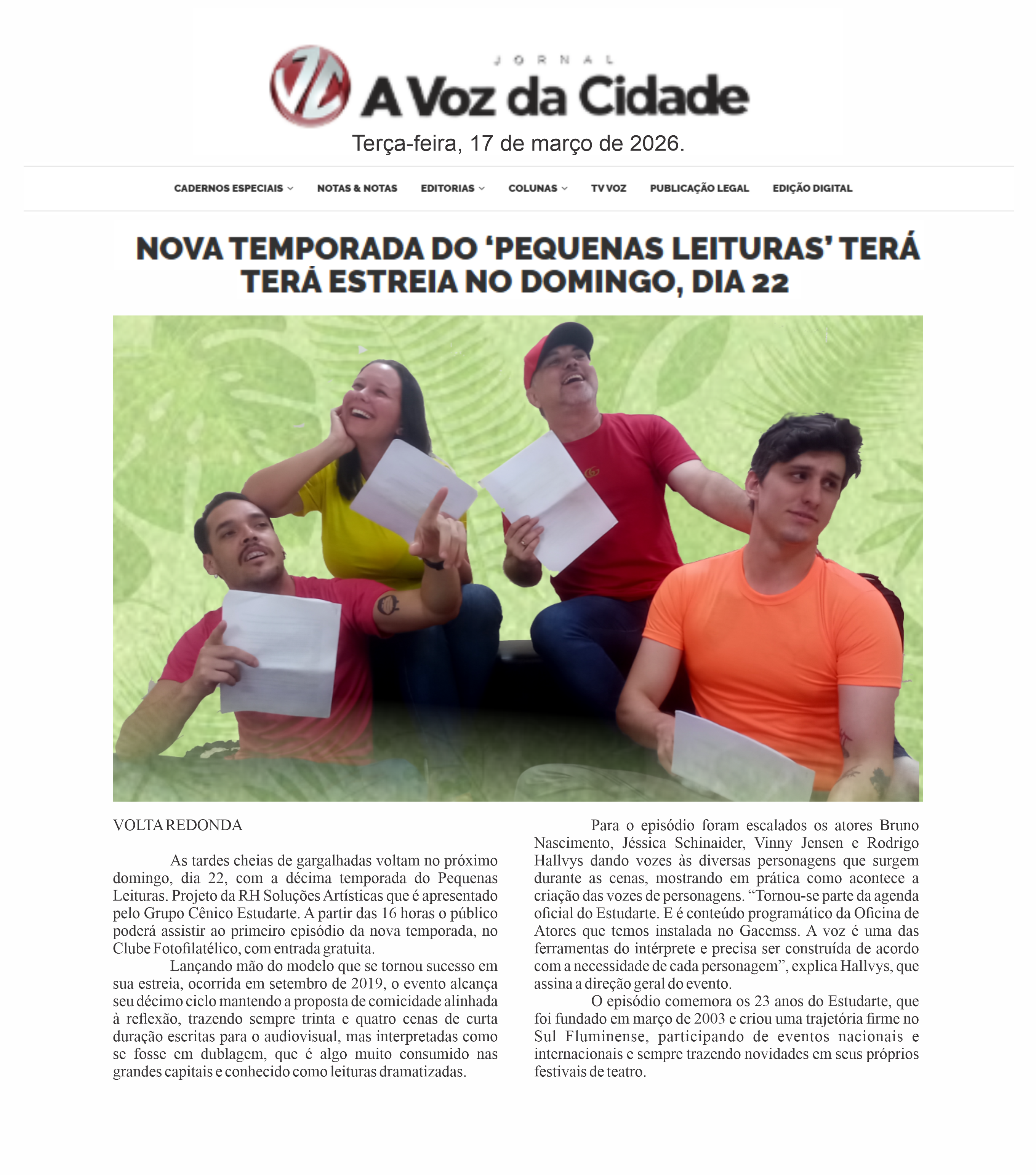 - Estamos comemorando muitos pontos. São mais de duas décadas de trabalhos. Tudo amadureceu, cresceu e quem teve maturidade e foco em carreira seguiu conosco. Hoje temos, dentre nossas turmas da Oficina de Atores, uma que é toda profissionalizada! Atores portando seus registros profissionais, os famosos DRTs. Estamos abrindo polos das oficinas para faixas etárias as quais já não trabalhávamos mais e integrantes profissionais estão assumindo tais turmas. Estamos gerando trabalhos, abrindo caminho para que haja sustento. Olhar para o Pequenas Leituras e ver que um projeto tão simples vigorou e passou a ocupar tantos lugares, ser convidado para tantas outras frentes é de nos alegrar muito - comemora Hallvys, com emoção nos olhos e sorriso estampado no rosto. Trajetória do projeto Lançado em setembro de 2019, o Pequenas Leituras passou a reunir integrantes do Estudarte para noites de leituras dramatizadas, acontecendo em encontros mensais. O sucesso da primeira temporada levou a trupe a seguir em frente com o projeto como parte da Oficina de Atores Estudarte, que passou a ser instalada no Gacemss, e ficar em cartaz por mais outras três temporadas no Premium Café (anexo ao Teatro Gacemss 1). Em 2023 o grupo migrou para o Logic Hotel, onde fez duas temporadas no restaurante do estabelecimento, consolidando o crescimento do volume de plateia e dispondo de nova gastronomia para as noites de seus episódios.Já em março de 2024, a RH Soluções Artísticas, empresa que administra do Estudarte, transferiu o evento para o Clube Fotofilatélico, na Vila Santa Cecília, em Volta Redonda, para as tardes de domingo, estreando sua sétima temporada, possibilitando que mais pessoas possam assistir e se divertir com as peripécias dos textos, que trazem humor e surpresas através das vozes criadas pelos atores. Em meio a tal trajetória, o Pequenas Leituras esteve em eventos como V Bienal do Livro de Volta Redonda, XVIII Jornada Cultural da Falerj (Federação das Academias de Letras do Estado do Rio de Janeiro), do Congresso Internacional da Alas (Académie des Lettres et Arts Luso-Suísse), duas edições do Festival Viva Cultura Alternativa, aniversário de 80 anos da Biblioteca Municipal Raul de Leoni, edições do Sarau ConVerso, duas edições do Festival Mostra Sua Arte, edições do Momentos de Reflexão na OAB-VR e os 44 anos da Livraria Veredas. Agora, iniciando a décima temporada (e com a próxima também já confirmada), o Estudarte comemora junto à plateia que o segue durante todos esses anos de trabalho e pesquisa. .Pequenas Leituras - Décima temporada - Episódio 1. Dia 22 de março (domingo), às 16h. Local: Clube Fotofilatélico de Volta Redonda. Direção: Rodrigo Hallvys. Elenco: Bruno Nascimento, Jéssica Schinaider, Rodrigo Hallvys e Vinny Jensen. Produção: RH Soluções Artísticas. Realização: Grupo Cênico Estudarte. Entrada: gratuita. Rede social: @grupoestudarte |
