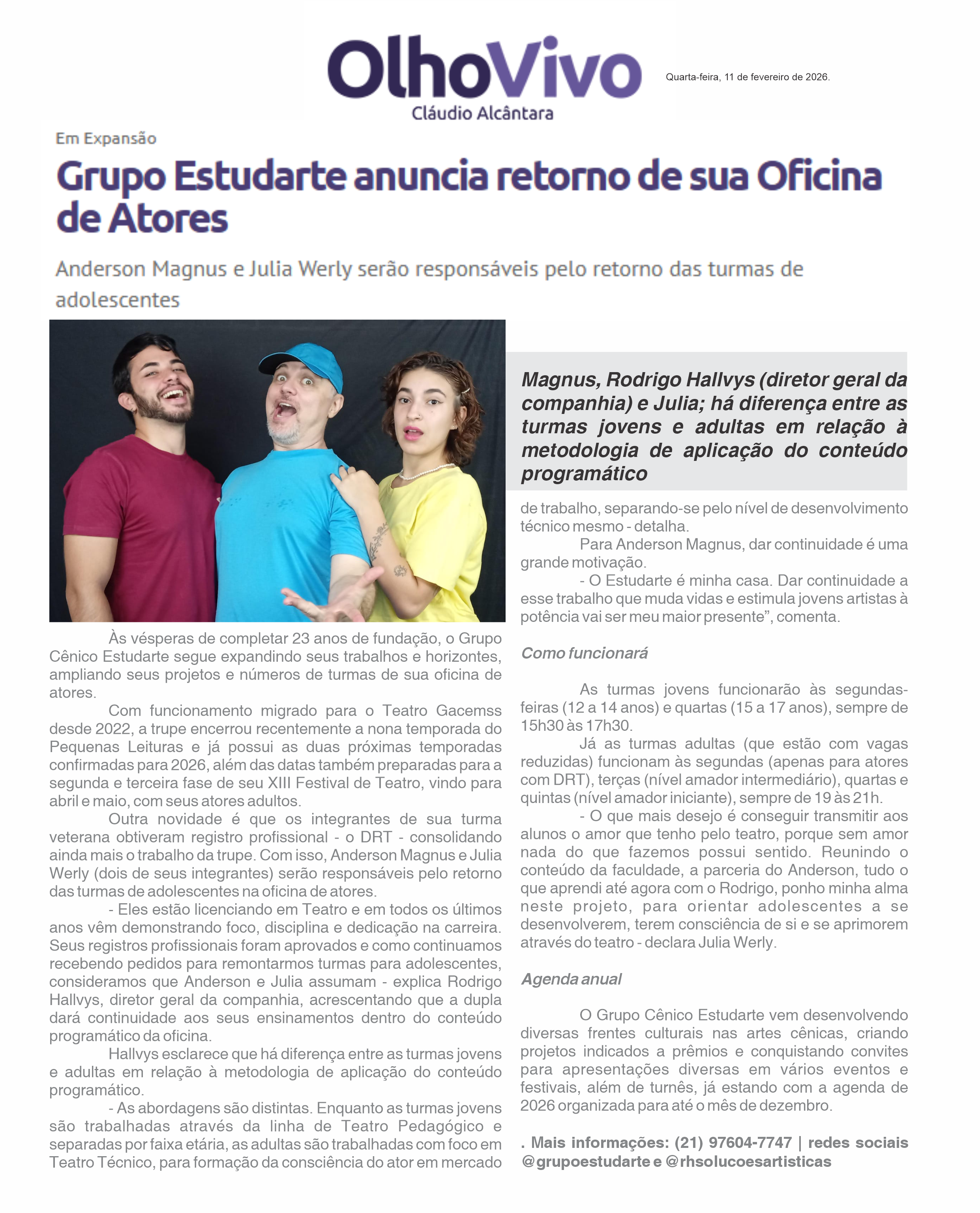 Com funcionamento migrado para o Teatro Gacemss desde 2022, a trupe encerrou recentemente a nona temporada do Pequenas Leituras e já possui as duas próximas temporadas confirmadas para 2026, além das datas também preparadas para a segunda e terceira fase de seu XIII Festival de Teatro, vindo para abril e maio, com seus atores adultos. Outra novidade é que os integrantes de sua turma veterana obtiveram registro profissional - o DRT - consolidando ainda mais o trabalho da trupe. Com isso, Anderson Magnus e Julia Werly (dois de seus integrantes) serão responsáveis pelo retorno das turmas de adolescentes na oficina de atores. - Eles estão licenciando em Teatro e em todos os últimos anos vêm demonstrando foco, disciplina e dedicação na carreira. Seus registros profissionais foram aprovados e como continuamos recebendo pedidos para remontarmos turmas para adolescentes, consideramos que Anderson e Julia assumam - explica Rodrigo Hallvys, diretor geral da companhia, acrescentando que a dupla dará continuidade aos seus ensinamentos dentro do conteúdo programático da oficina. Hallvys esclarece que há diferença entre as turmas jovens e adultas em relação à metodologia de aplicação do conteúdo programático. - As abordagens são distintas. Enquanto as turmas jovens são trabalhadas através da linha de Teatro Pedagógico e separadas por faixa etária, as adultas são trabalhadas com foco em Teatro Técnico, para formação da consciência do ator em mercado de trabalho, separando-se pelo nível de desenvolvimento técnico mesmo - detalha. Para Anderson Magnus, dar continuidade é uma grande motivação. - O Estudarte é minha casa. Dar continuidade a esse trabalho que muda vidas e estimula jovens artistas à potência vai ser meu maior presente, comenta. Como funcionará As turmas jovens funcionarão às segundas-feiras (12 a 14 anos) e quartas (15 a 17 anos), sempre de 15h30 às 17h30. Já as turmas adultas (que estão com vagas reduzidas) funcionam às segundas (apenas para atores com DRT), terças (nível amador intermediário), quartas e quintas (nível amador iniciante), sempre de 19 às 21h. - O que mais desejo é conseguir transmitir aos alunos o amor que tenho pelo teatro, porque sem amor nada do que fazemos possui sentido. Reunindo o conteúdo da faculdade, a parceria do Anderson, tudo o que aprendi até agora com o Rodrigo, ponho minha alma neste projeto, para orientar adolescentes a se desenvolverem, terem consciência de si e se aprimorem através do teatro - declara Julia Werly. Agenda anual O Grupo Cênico Estudarte vem desenvolvendo diversas frentes culturais nas artes cênicas, criando projetos indicados a prêmios e conquistando convites para apresentações diversas em vários eventos e festivais, além de turnês, já estando com a agenda de 2026 organizada para até o mês de dezembro. . Mais informações: (21) 97604-7747 | redes sociais @grupoestudarte e @rhsolucoesartisticas |