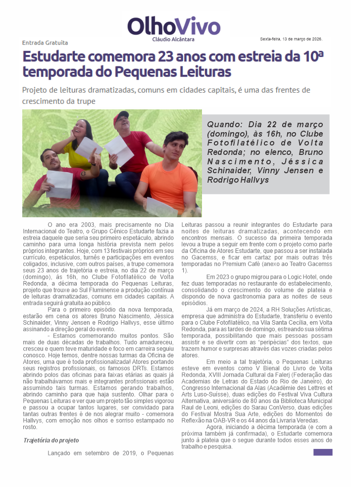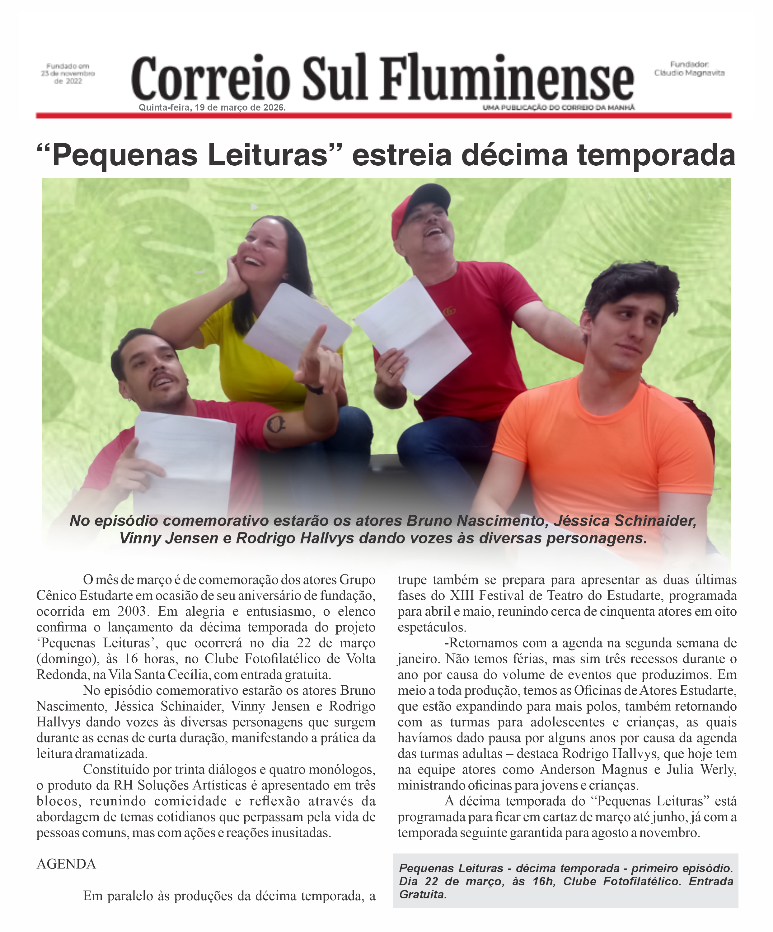- Estamos comemorando muitos pontos. São mais de duas décadas de trabalhos. Tudo amadureceu, cresceu e quem teve maturidade e foco em carreira seguiu conosco. Hoje temos, dentre nossas turmas da Oficina de Atores, uma que é toda profissionalizada! Atores portando seus registros profissionais, os famosos DRTs. Estamos abrindo polos das oficinas para faixas etárias as quais já não trabalhávamos mais e integrantes profissionais estão assumindo tais turmas. Estamos gerando trabalhos, abrindo caminho para que haja sustento. Olhar para o Pequenas Leituras e ver que um projeto tão simples vigorou e passou a ocupar tantos lugares, ser convidado para tantas outras frentes é de nos alegrar muito - comemora Hallvys, com emoção nos olhos e sorriso estampado no rosto. Trajetória do projeto Lançado em setembro de 2019, o Pequenas Leituras passou a reunir integrantes do Estudarte para noites de leituras dramatizadas, acontecendo em encontros mensais. O sucesso da primeira temporada levou a trupe a seguir em frente com o projeto como parte da Oficina de Atores Estudarte, que passou a ser instalada no Gacemss, e ficar em cartaz por mais outras três temporadas no Premium Café (anexo ao Teatro Gacemss 1). Em 2023 o grupo migrou para o Logic Hotel, onde fez duas temporadas no restaurante do estabelecimento, consolidando o crescimento do volume de plateia e dispondo de nova gastronomia para as noites de seus episódios.Já em março de 2024, a RH Soluções Artísticas, empresa que administra do Estudarte, transferiu o evento para o Clube Fotofilatélico, na Vila Santa Cecília, em Volta Redonda, para as tardes de domingo, estreando sua sétima temporada, possibilitando que mais pessoas possam assistir e se divertir com as peripécias dos textos, que trazem humor e surpresas através das vozes criadas pelos atores. Em meio a tal trajetória, o Pequenas Leituras esteve em eventos como V Bienal do Livro de Volta Redonda, XVIII Jornada Cultural da Falerj (Federação das Academias de Letras do Estado do Rio de Janeiro), do Congresso Internacional da Alas (Académie des Lettres et Arts Luso-Suísse), duas edições do Festival Viva Cultura Alternativa, aniversário de 80 anos da Biblioteca Municipal Raul de Leoni, edições do Sarau ConVerso, duas edições do Festival Mostra Sua Arte, edições do Momentos de Reflexão na OAB-VR e os 44 anos da Livraria Veredas. Agora, iniciando a décima temporada (e com a próxima também já confirmada), o Estudarte comemora junto à plateia que o segue durante todos esses anos de trabalho e pesquisa. .Pequenas Leituras - Décima temporada - Episódio 1. Dia 22 de março (domingo), às 16h. Local: Clube Fotofilatélico de Volta Redonda. Direção: Rodrigo Hallvys. Elenco: Bruno Nascimento, Jéssica Schinaider, Rodrigo Hallvys e Vinny Jensen. Produção: RH Soluções Artísticas. Realização: Grupo Cênico Estudarte. Entrada: gratuita. Rede social: @grupoestudarte |